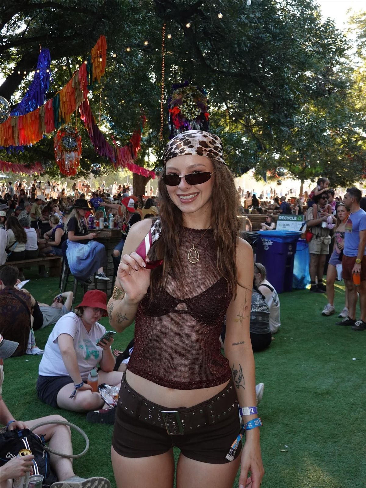This one feels very effortless, like she just threw it on but still looks amazing. The brown sheer top with the matching shorts is so flattering, and that bandana adds that festival vibe instantly.