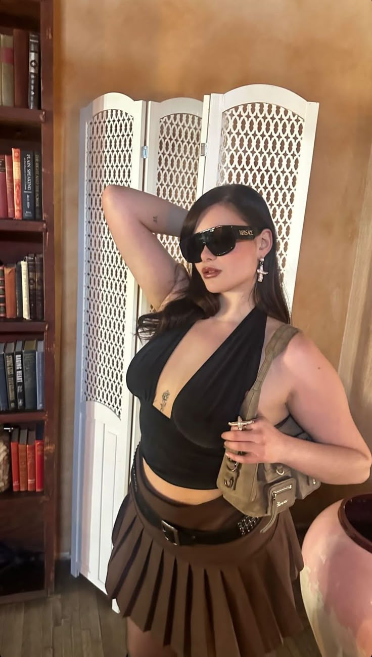 This one is giving slightly edgy Coachella, like a little darker but still very cute. The black halter top with that brown pleated skirt works so well together, and the bag just completes it. Omg, she’s pulling this off so well. This feels like a night-time festival outfit.
