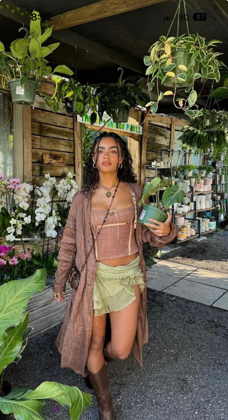 Okay this outfit is actually so pretty I had to stare at it for a second. The brown corset top with that soft green ruffle skirt is such a nice color combo, like earthy but still feminine. And the long flowy duster adds that extra layer that makes it feel more styled. She’s pulling this off so well, especially with the boots, it gives it a bit of edge.