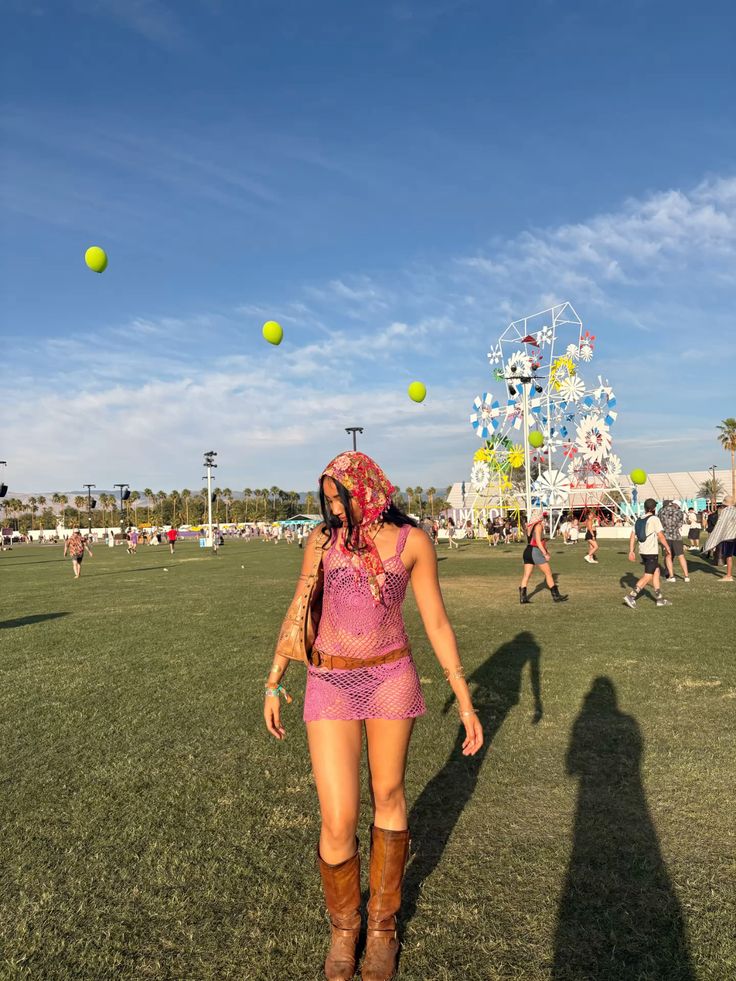 This one is giving full festival energy. The pink crochet dress is bold but still breathable and easy, and pairing it with those brown boots just grounds the whole look.