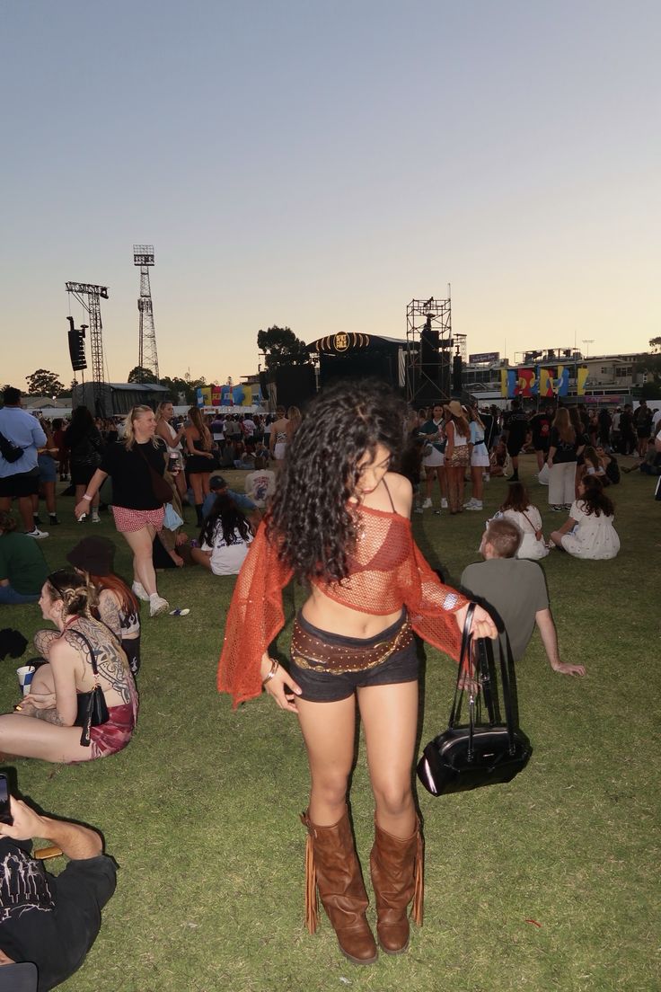 I actually love this one so much. The red mesh top is such a statement piece but the rest of the outfit keeps it grounded. And those boots just make everything feel cohesive. omg she’s pulling this off so well, like it’s giving festival but not overdone.