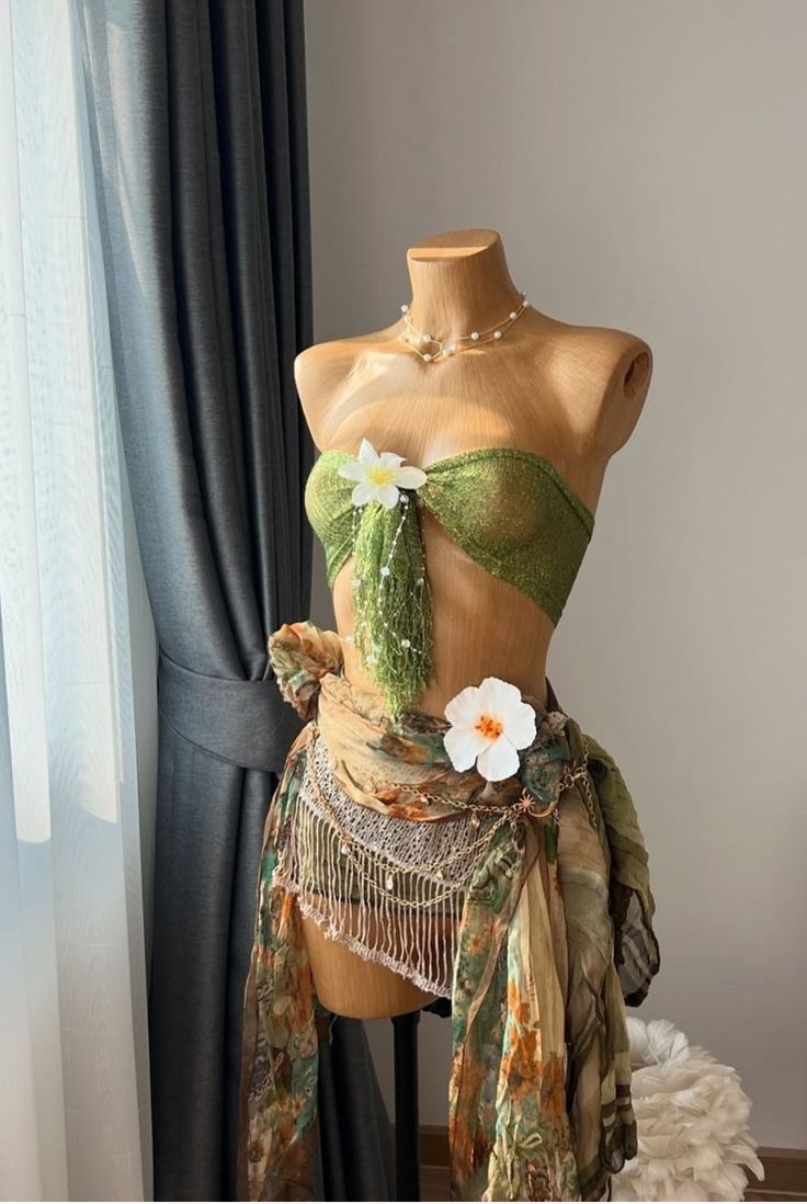 This outfit is sooo dreamy and artsy. The sage green draped top with the matching flowy wrap pieces gives it that handmade fairy-festival look that people always stop and stare at. The little floral appliqué details make it feel extra special too, like way more styled than just a basic festival outfit. omg she’s pulling this off so well, this really suits her and it feels soft, creative, and super pretty all at once.