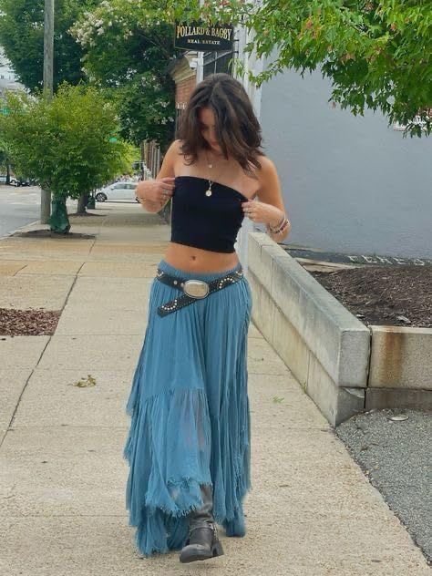 I love this one so much, it’s giving slightly western but still very wearable. The black fitted top with that brown flowy skirt is such a good combo, and the cowboy hat just makes it more fun.