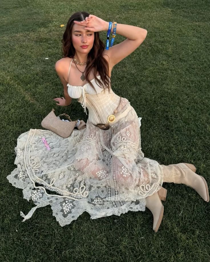 This one feels like something out of a soft vintage dream. The lace, the corset shape, the boots… everything is just working together so well. It’s feminine but still a little bold, which I love. omg she’s pulling this off so well, like this could literally be a festival or picnic look and it would fit both.