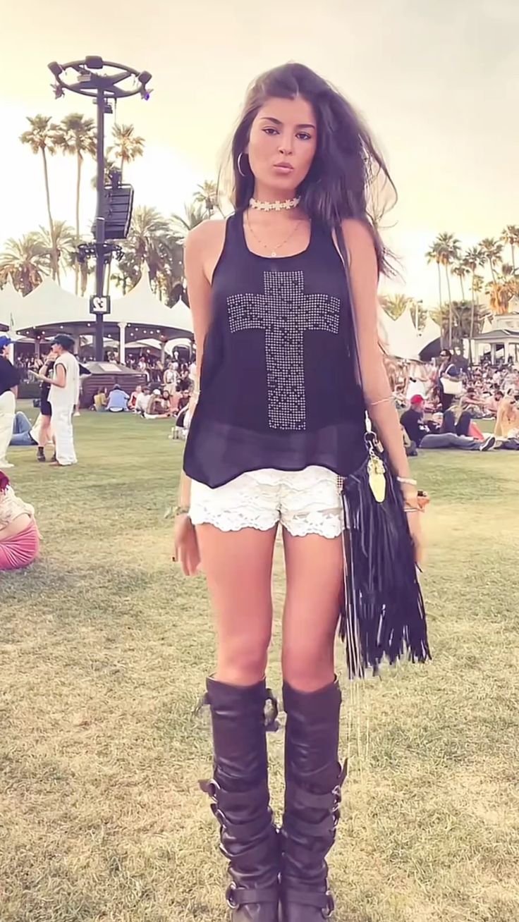 This one is a little edgy but still super wearable. The black sheer tank with that cross detail stands out immediately, and the white lace shorts soften it just enough. And those boots?? they complete the whole look. She’s pulling this off so well, it feels bold but still easy.