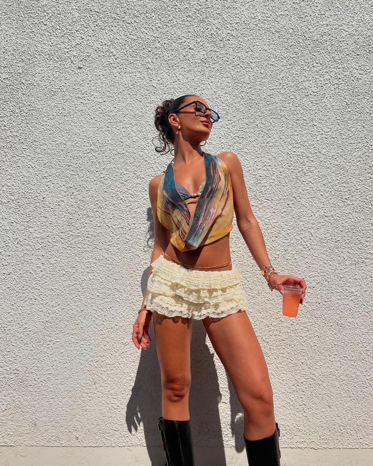 This outfit is honestly so fun and a little bold in the best way. The printed halter top with that tiny ruffle skirt feels very flirty but still relaxed. And the boots balance it out so it doesn’t feel too dressed up. She’s pulling this off so well, like it looks hot but still chill.