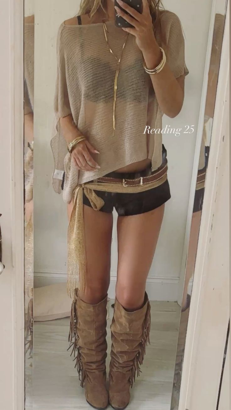 This one is such a cool layered look. The sheer knit top over a bralette with those tiny shorts feels very effortless but still styled. And the fringe boots?? they add that whole western-boho thing instantly. This really suits her, it feels relaxed but still intentional.