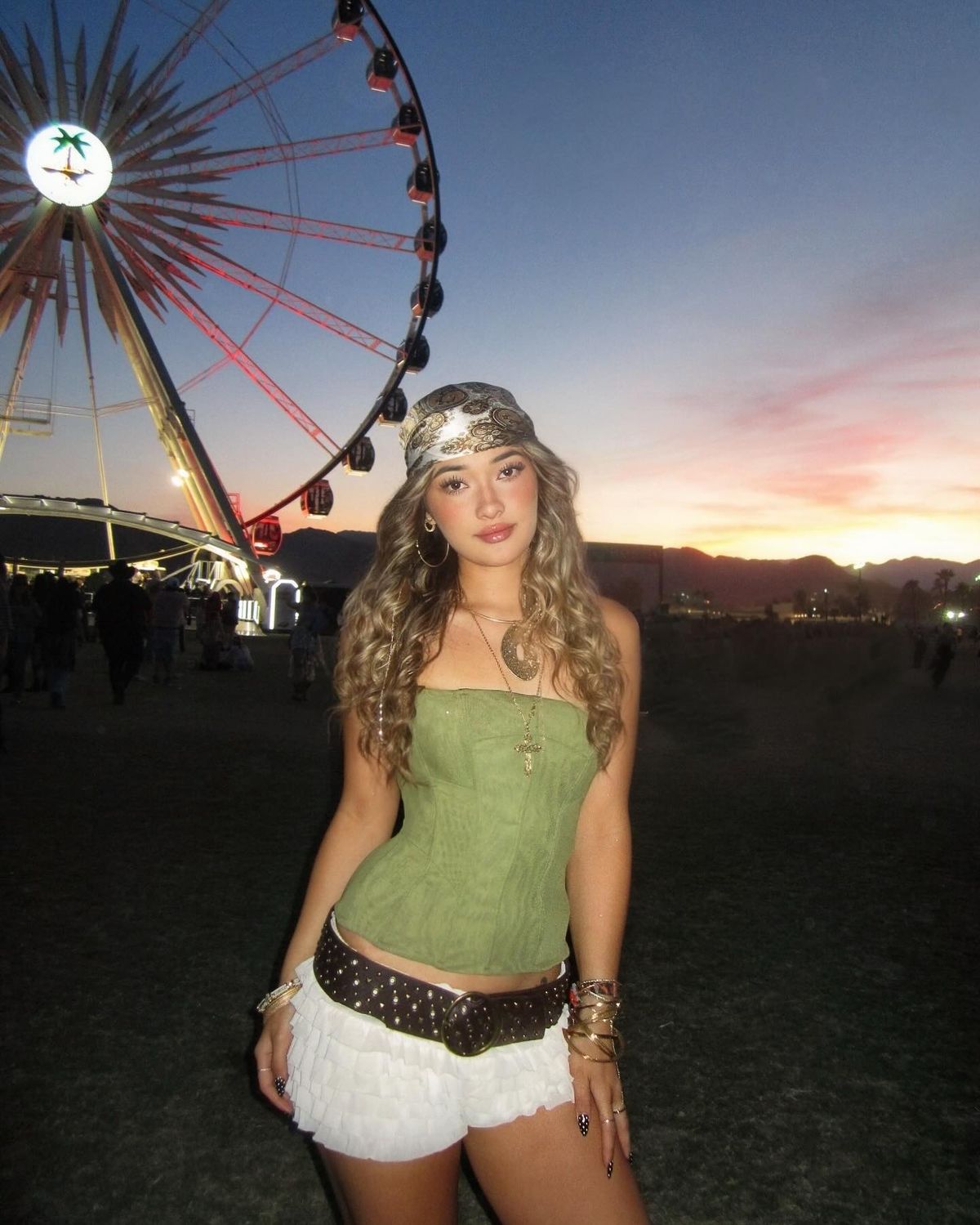 I love this one so much. The green corset is such a good choice for Coachella. Paired with the white ruffle shorts, it looks soft but still structured. Also, the belt is so cute. Omg, she’s pulling this off so well. This is one of those outfits you’d screenshot instantly.