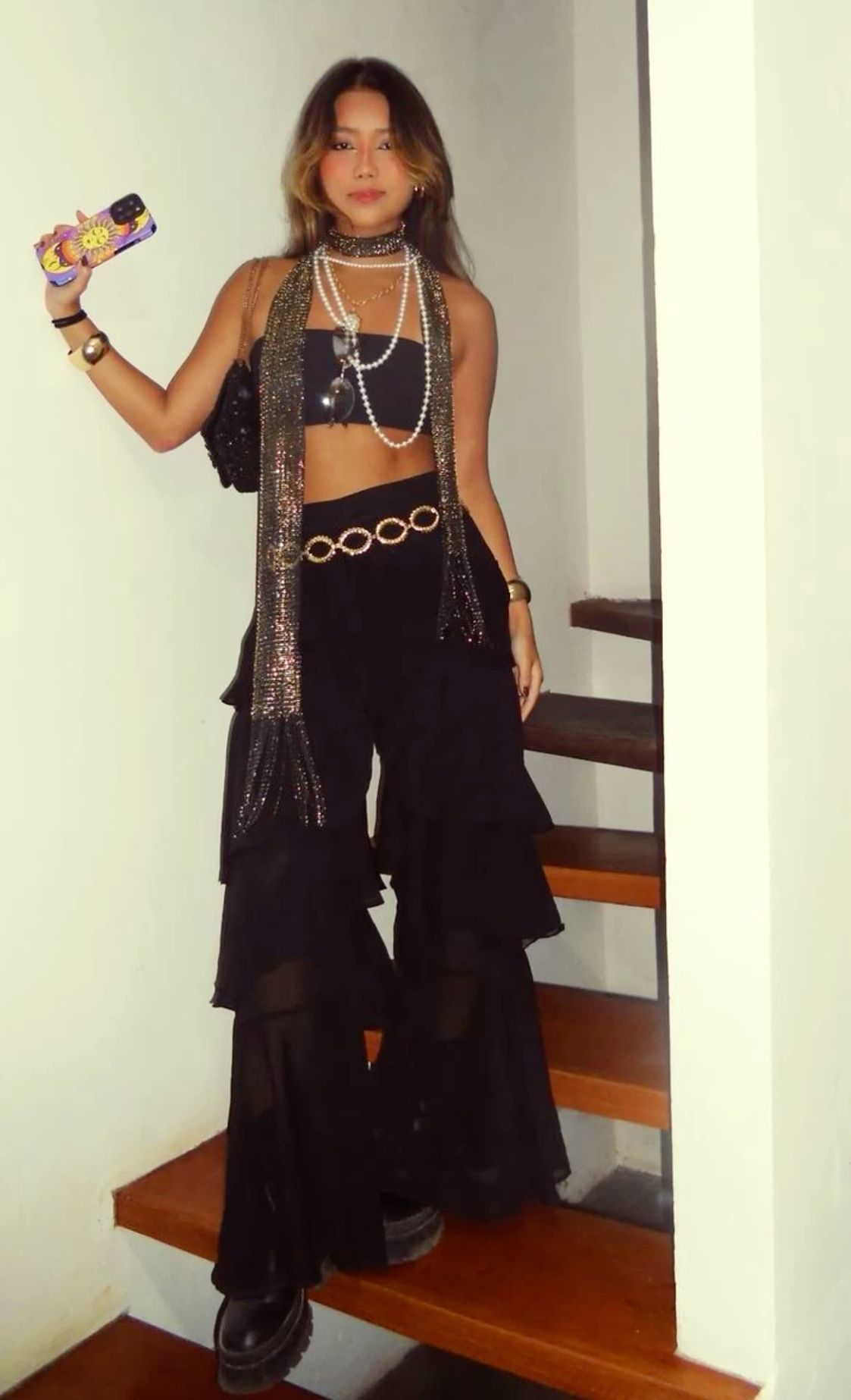 Okay this one is giving full boho-rock energy. The black bandeau with those flowy ruffle pants looks so dramatic in the best way. And that long sparkly scarf with layered necklaces?? it’s doing a lot but somehow it all works. This really suits her, she looks so confident in it.