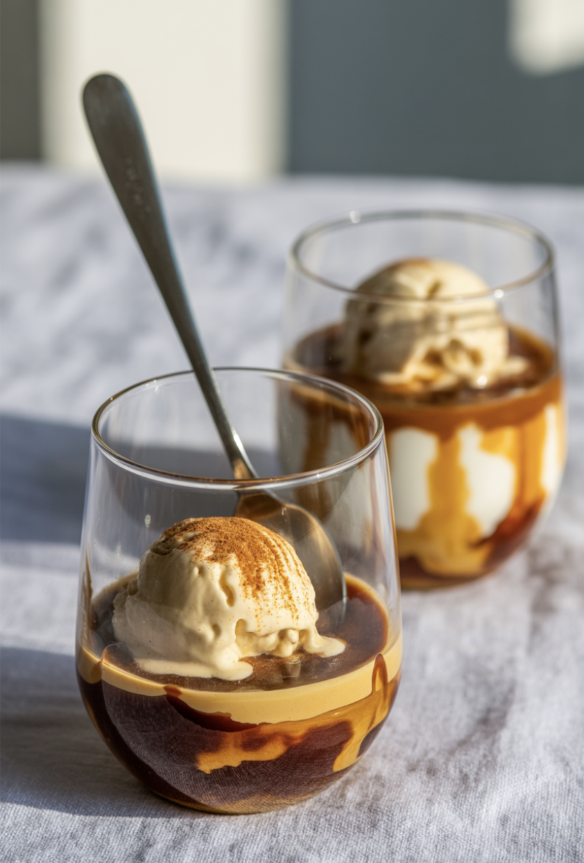 A fancy little treat for coffee lovers — espresso poured over pumpkin ice cream.