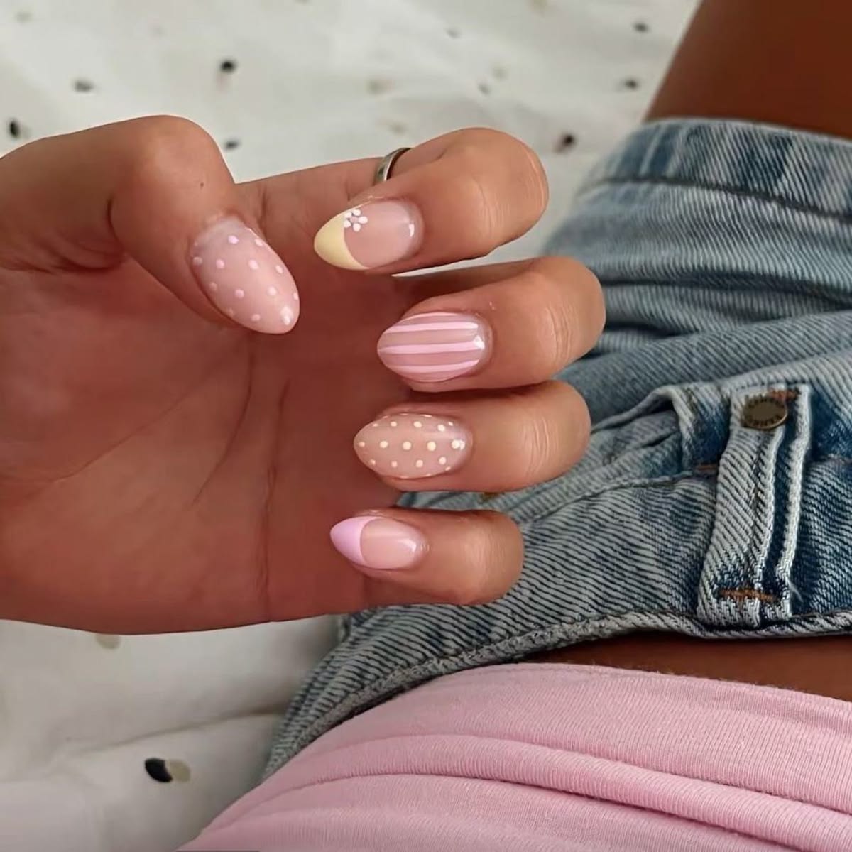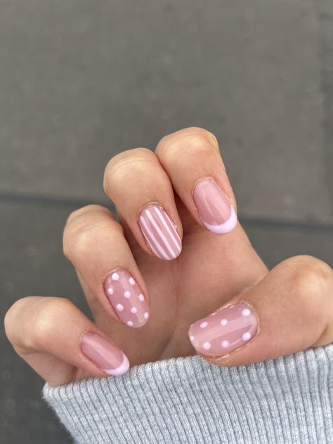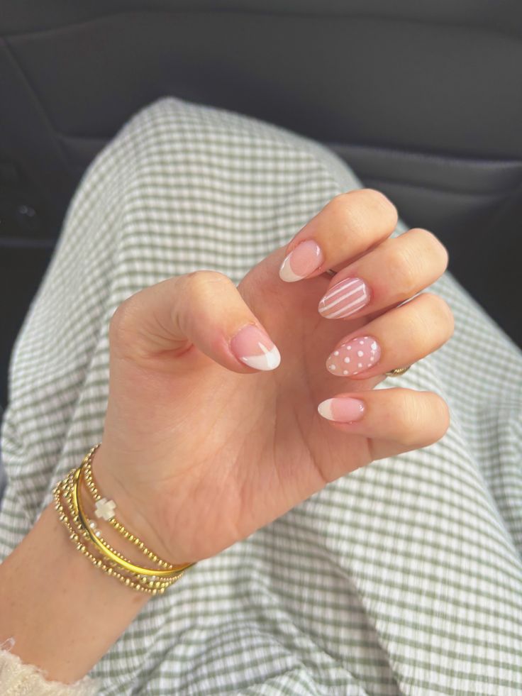 This one is kinda similar but a bit more pastel toned. There’s a soft pink base, one nail with polka dots, one with stripes, and one with a clean french tip.