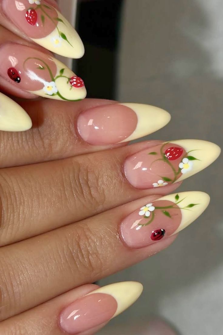 This one is sooo spring picnic coded 😭 The tips are this soft buttery yellow, and then you have little strawberries, flowers, and even a tiny ladybug on some nails.