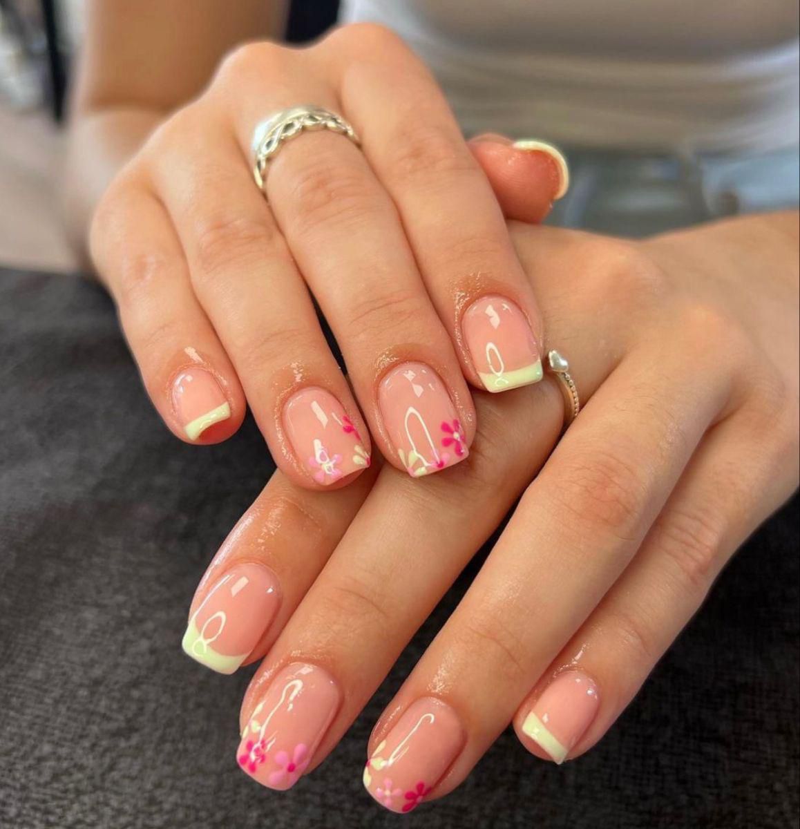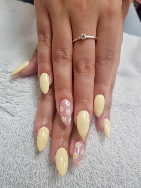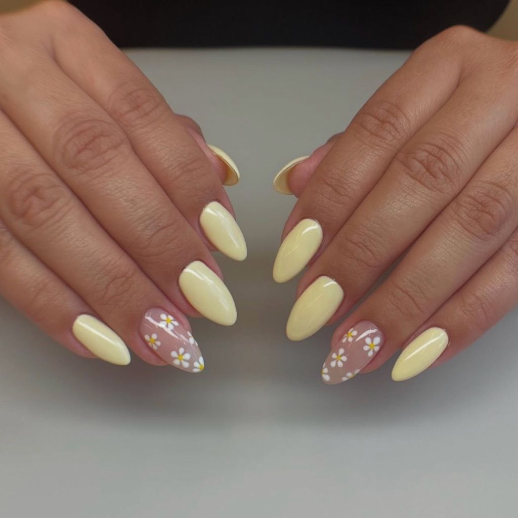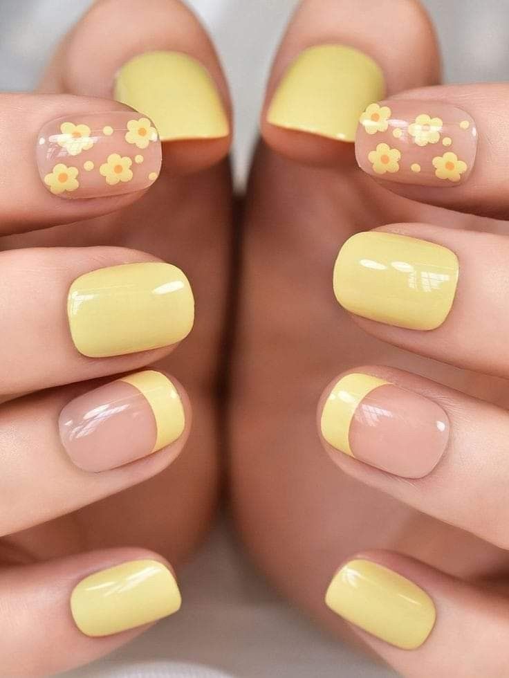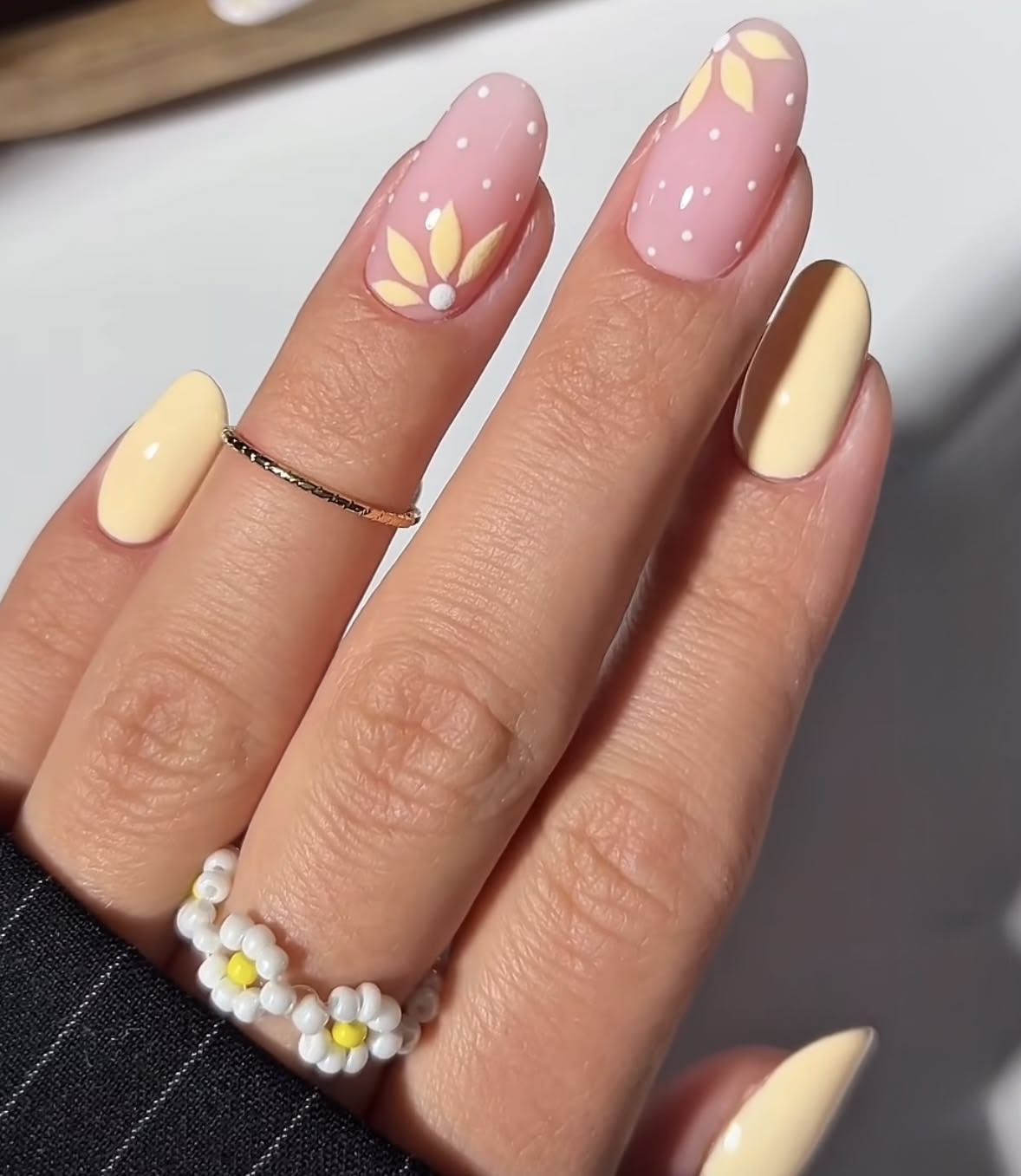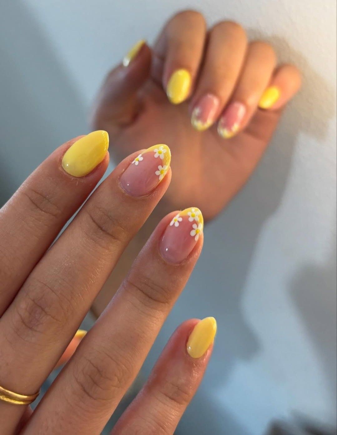 Okay this is giving sunshine in nail form lol. A couple of nails are painted in this bright pastel yellow, and the rest have a clear pink base with little white daisies along the tips.