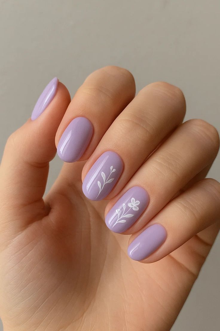 Similar vibe but slightly brighter lilac, with white line-art flowers on accent nails.