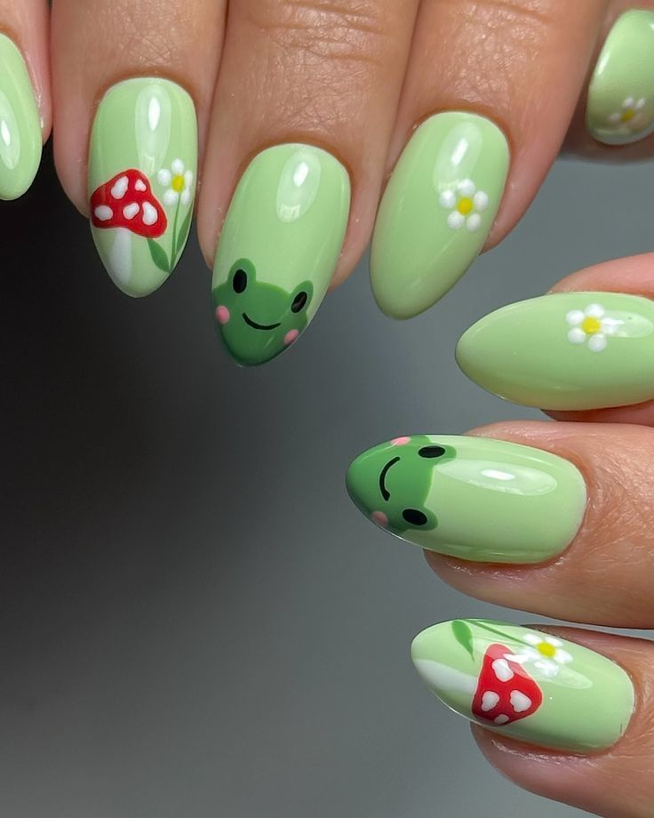 Soft green nails with tiny frogs, mushrooms, and little flowers.