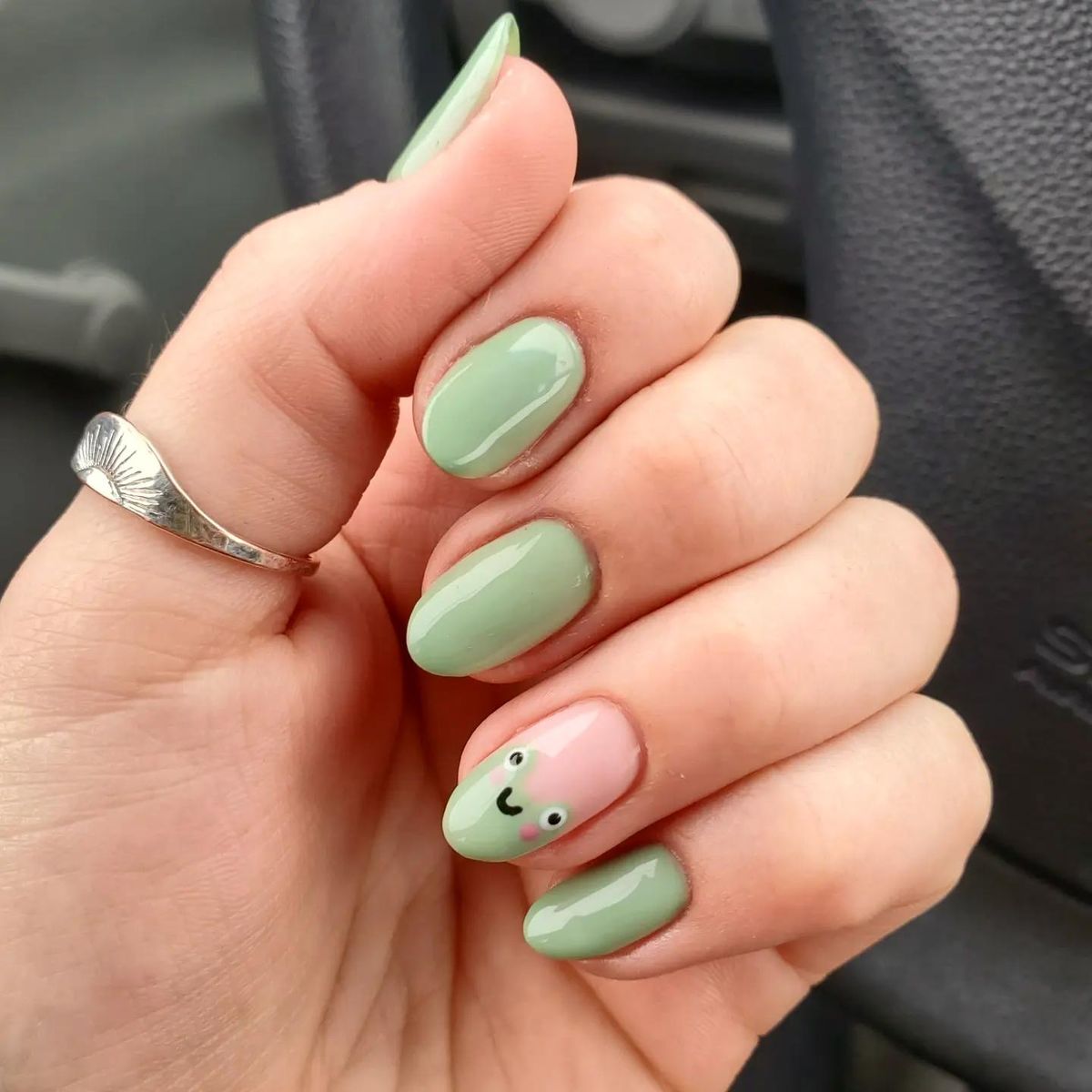 Simple sage green nails with one accent nail featuring a cute frog face.