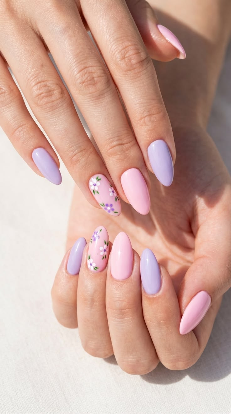 Alternating pink and lavender nails with delicate floral detailing on accent nails.