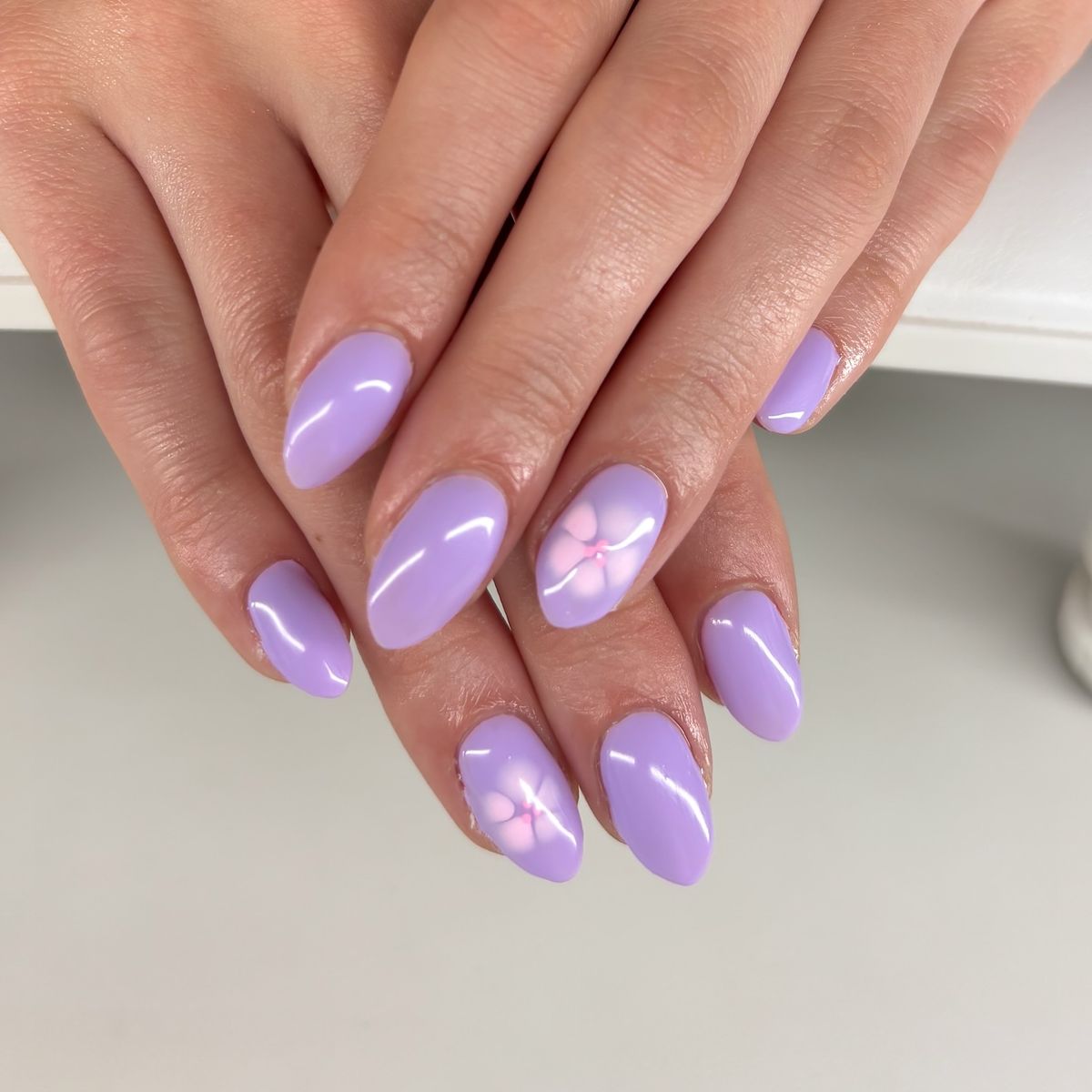 This is such a dreamy lilac set omg. Most nails are painted in this glossy pastel purple, and then one or two have this soft flower design blended into the polish.