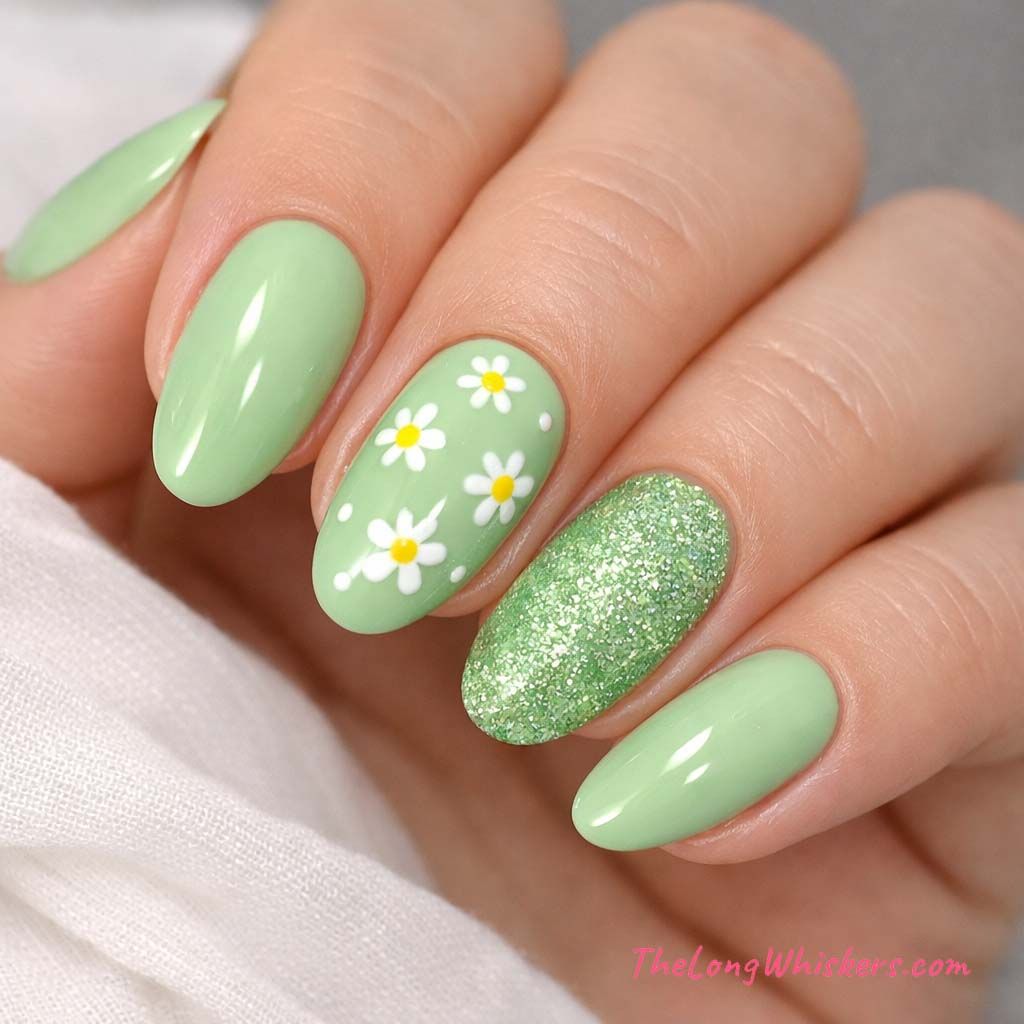 Glossy mint nails, one glitter accent nail, and one daisy design nail.