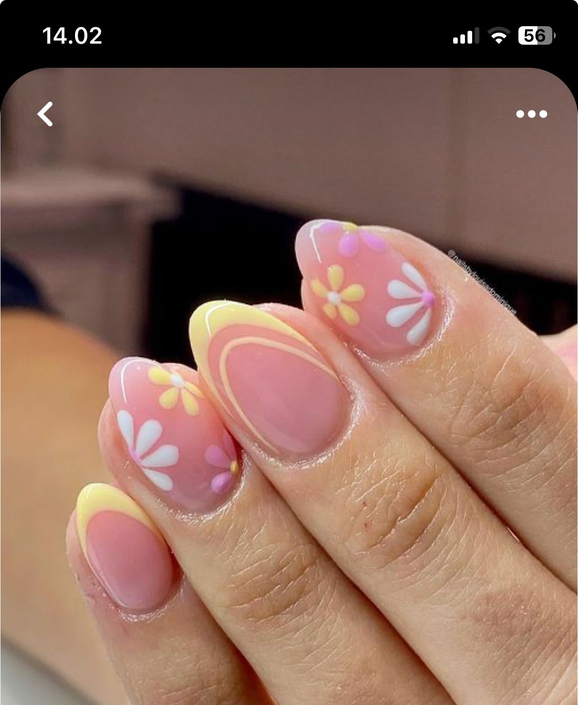 This one is soooo fresh. Like actual spring in nail form. The daisies are spaced out just right so it doesn’t feel crowded. This really suits her, it’s giving picnic + sunshine vibes.