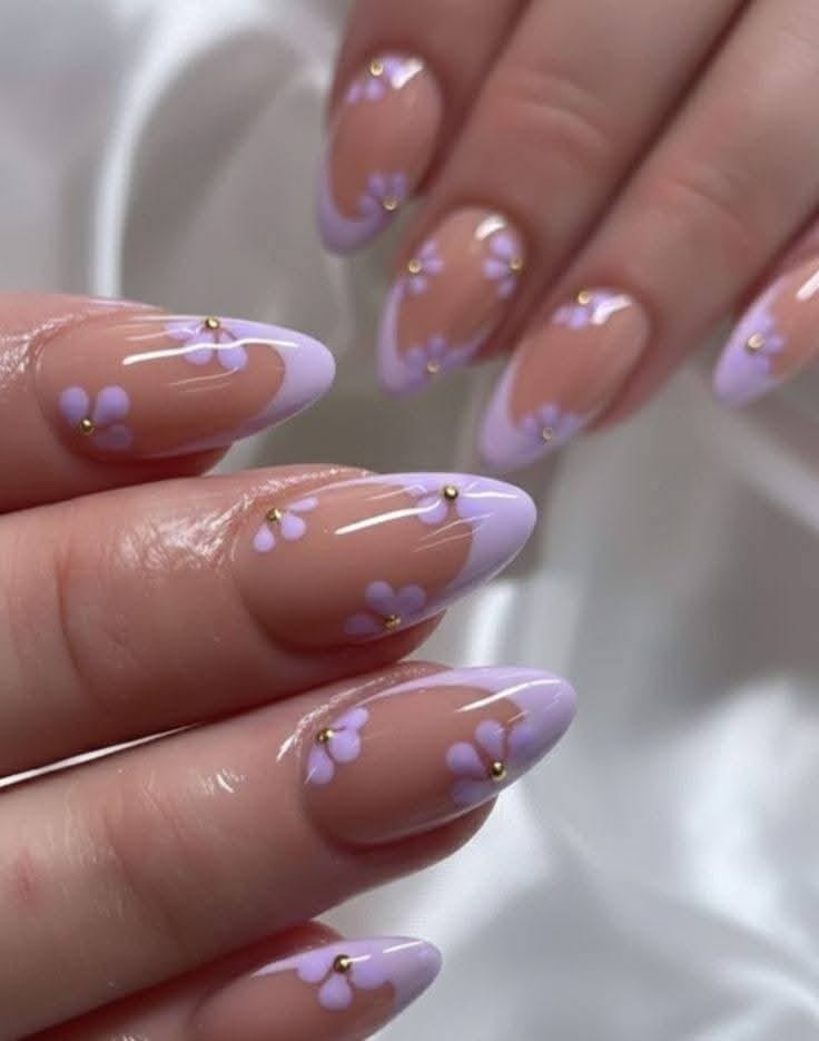 Classic almond nails with soft lilac French tips and tiny flowers with gold dot centers.