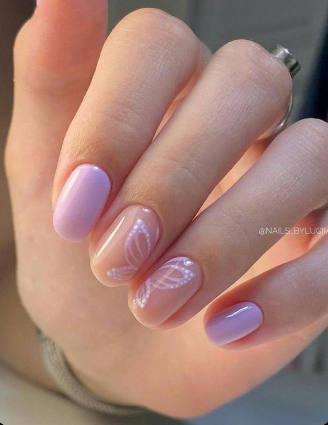 Okay this one is STUNNING. Some nails are painted in this soft lilac shade, and the others have this detailed butterfly wing design with black outlines and tiny white dots.