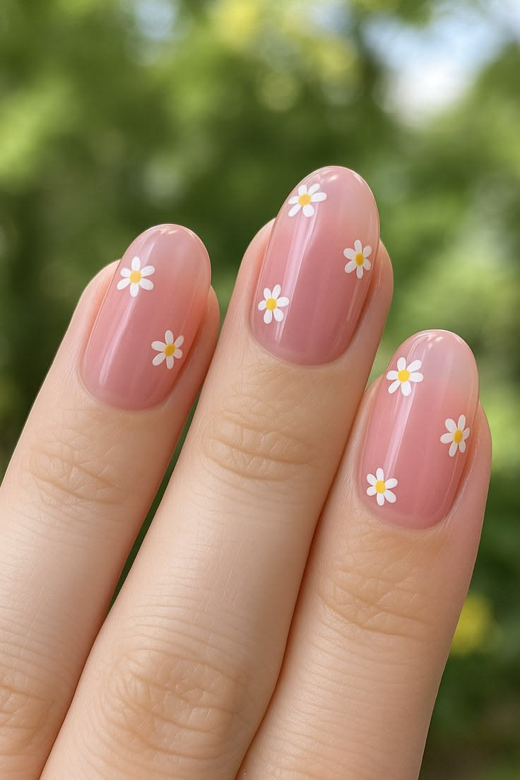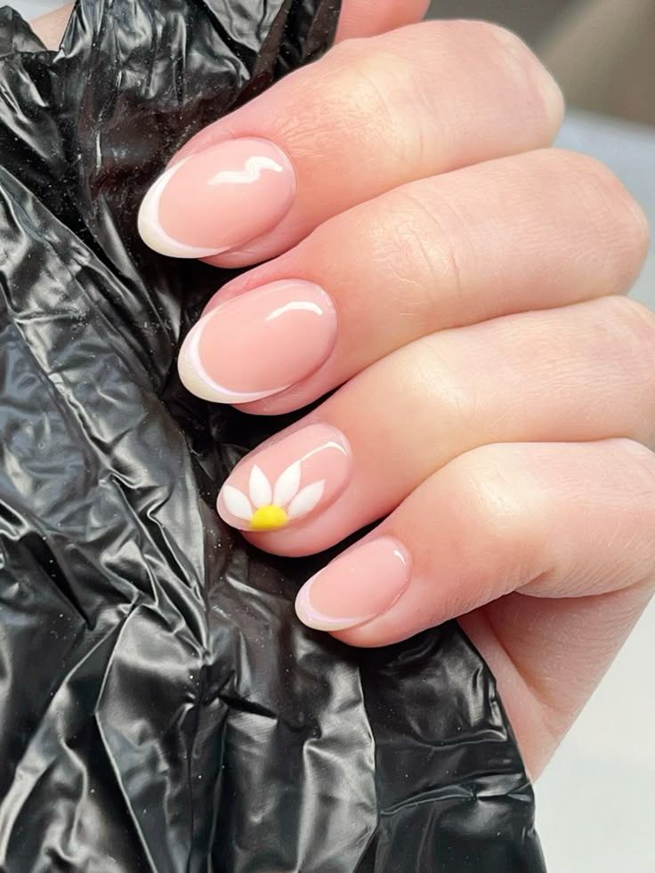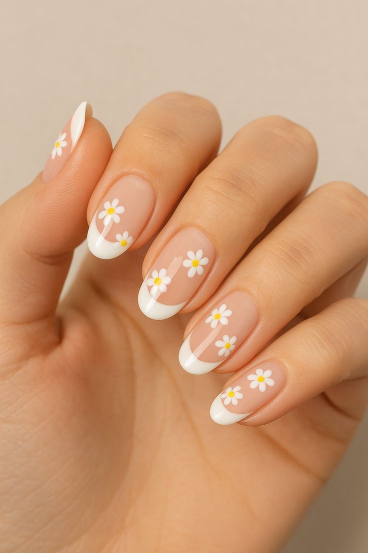 A soft nude base, crisp white French tips, and delicate little daisy accents.
