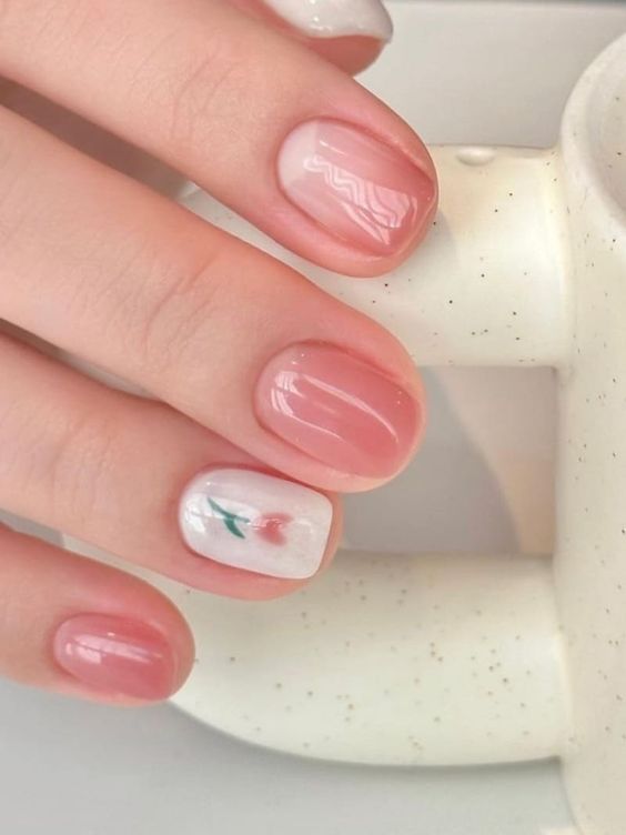 These are super clean and simple. Just a nude glossy base with classic white french tips, and tiny little cherries placed on a couple of nails.