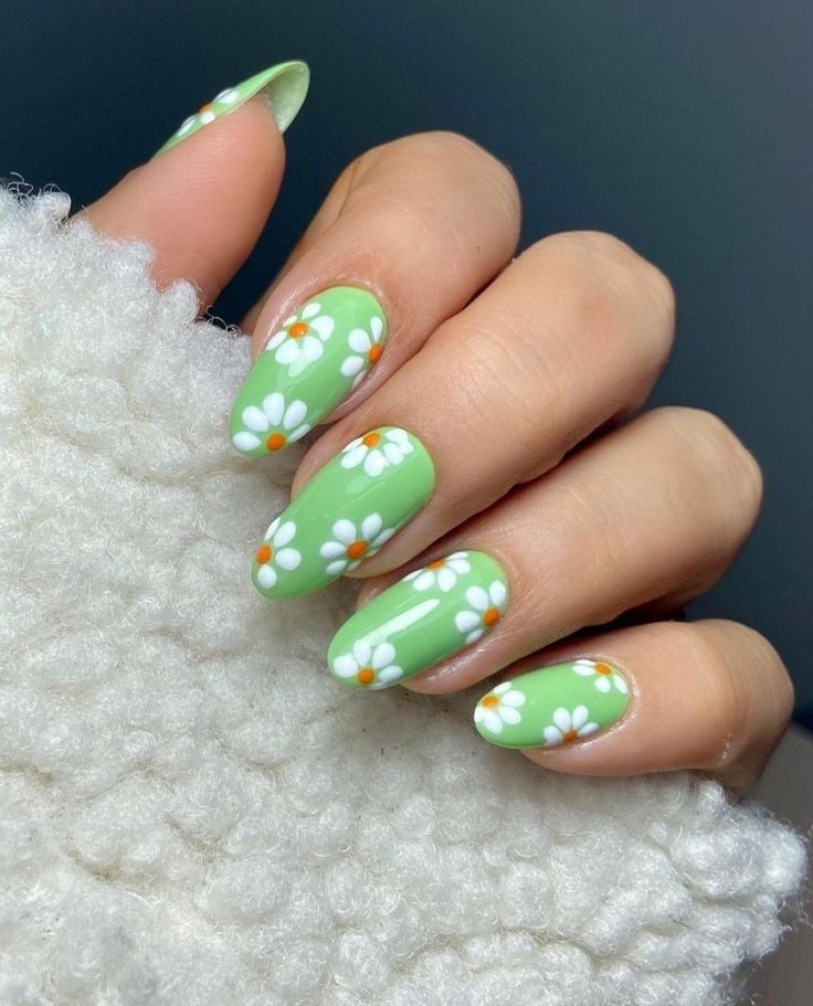 Okay this one feels very calm girl spring. Most of the nails are painted in this soft sage green, and then a couple of accent nails have these white daisies with little green centers.