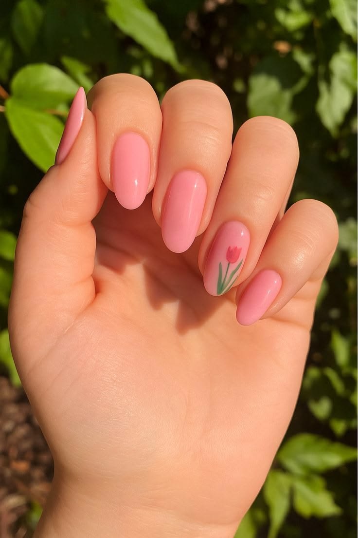 A solid soft pink manicure with one tiny tulip design on an accent nail.