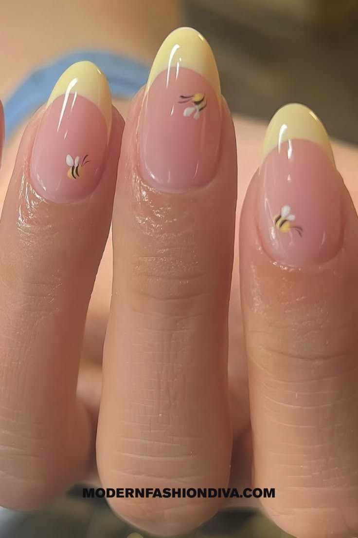 Simple nude nails with soft yellow French tips and tiny little bee accents.