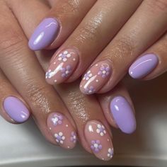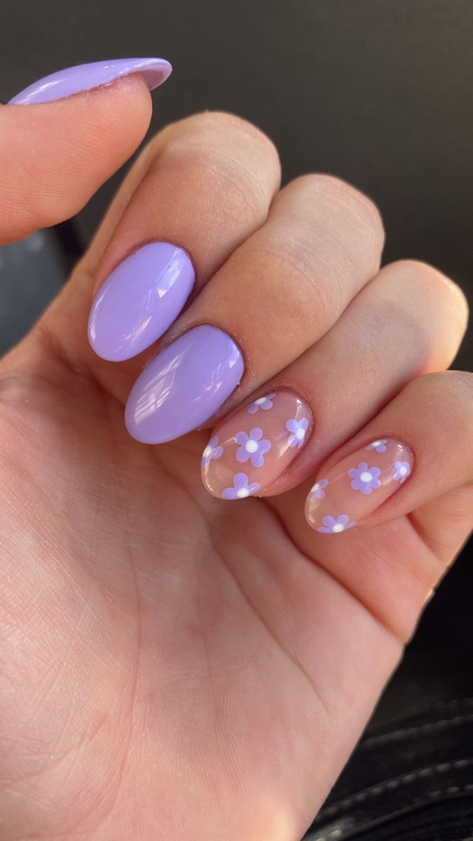Mostly solid lavender nails with a couple of sheer accent nails that have tiny white flowers.