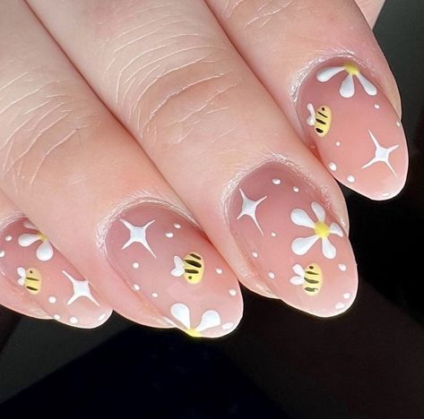 A sheer nude base with tiny bees, flowers, and little sparkles scattered across.
