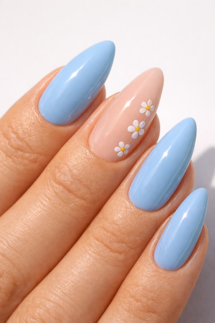 Glossy pastel blue nails paired with a sheer nude accent nail that has tiny white daisies.