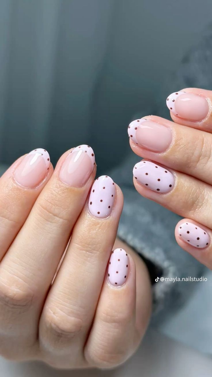 This one is kinda different but in a good way. The base is this milky soft pink, and then you’ve got these tiny brown polka dots all over.