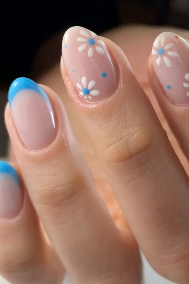 1. Nude Almond Nails with Tiny Blue Daisy Details