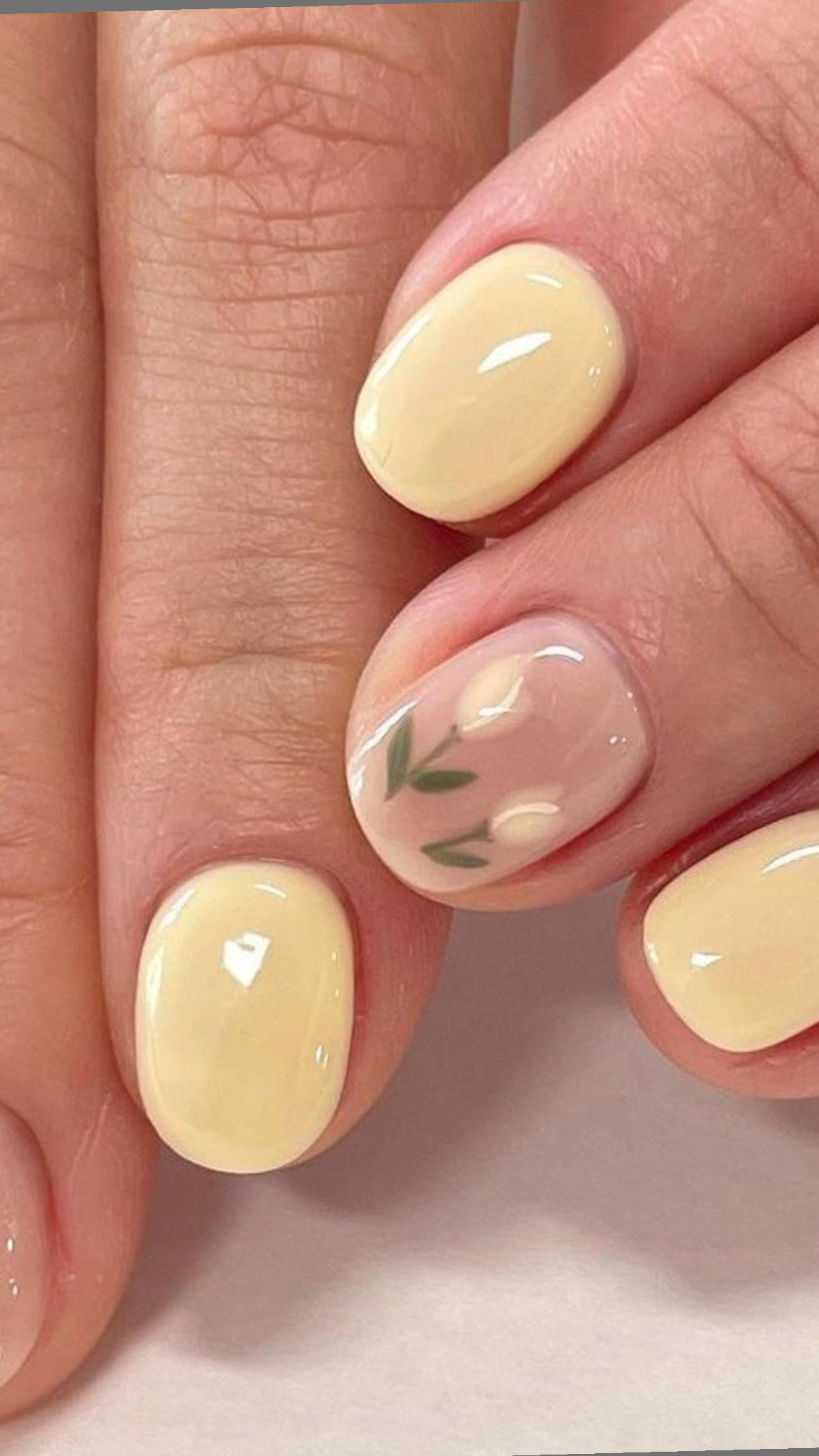 This one is such a pretty pastel yellow set. Most nails are just glossy butter yellow, and one nail has a sheer base with a tiny white flower and green leaves.