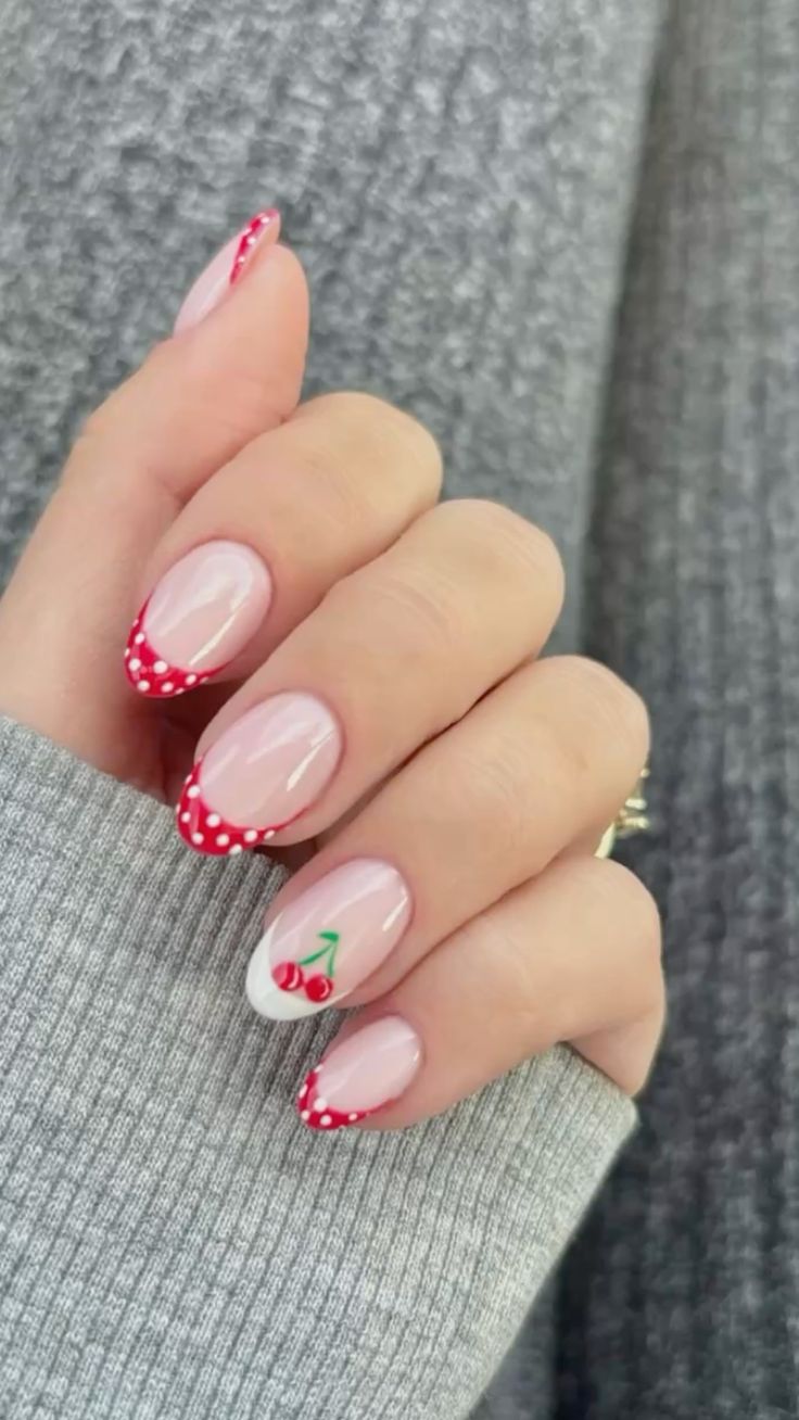 This is giving retro vibes but make it cute. The base is sheer pink, and the tips are red with tiny white polka dots. One nail even has a little cherry design.