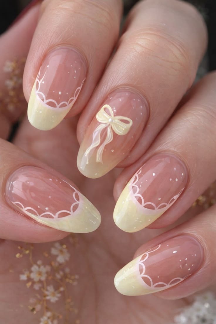 A sheer pink base with buttery yellow tips, delicate white lace detailing, and a tiny bow accent.