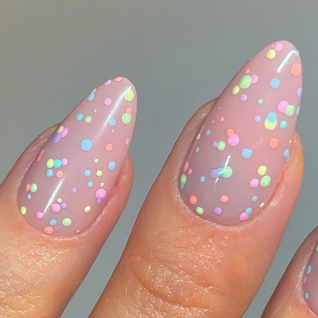 These are almond nails with a sheer nude-pink base. Near the tips, there are small scattered pastel dots in yellow, blue, pink, purple, and green, almost like confetti.