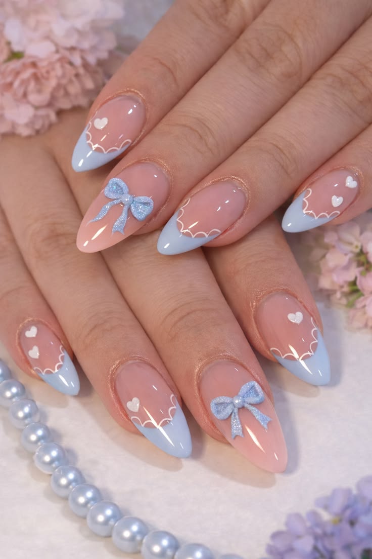 A nude base with baby blue French tips, tiny white hearts, and a 3D glitter bow.